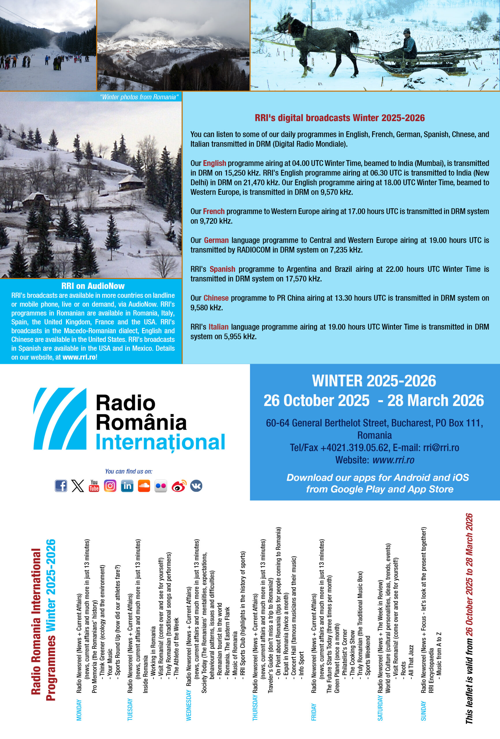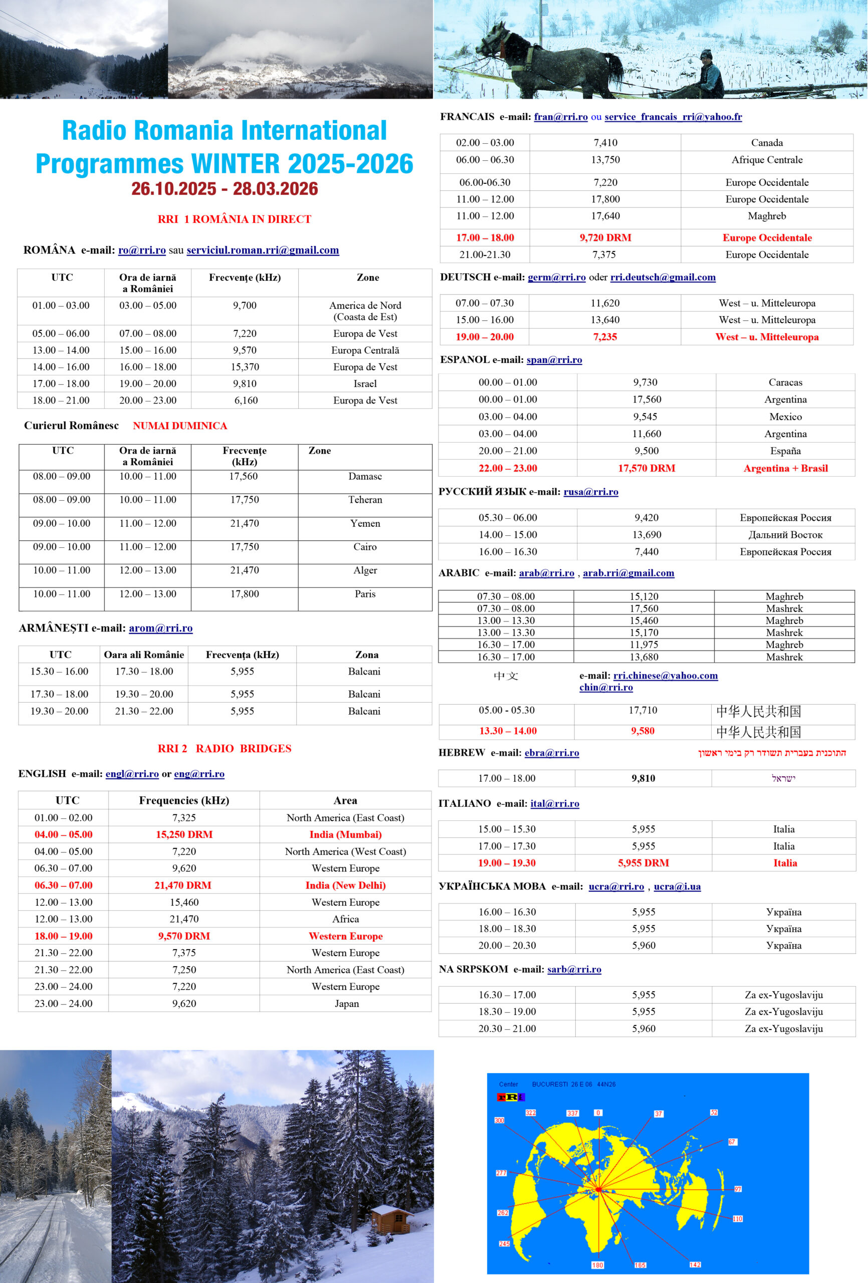 Recepţia programelor RRI în limba română în perioada 26 octombrie 2025 – 28 martie 2026: